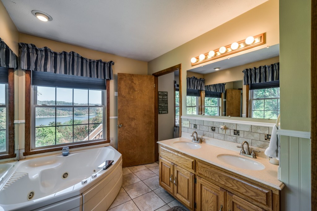 Most will mention the view from the deck, the hot tub, even the living or game rooms, but one of my favorite places in the home? The master bathroom. You can see the lake, the tv AND the fireplace all from the comfort of this jetted tub! Ledges are perfect for relaxing with a glass of wine or a mug of cocoa.